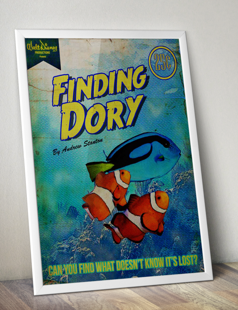 I went to work by adding in the elements that gave it its vintage feel. The theme is primarily yellow and blue is because these were the main colors in the fish that Dory is. The colors were picked directly from her. The 25 cents and the old Walt Disney logo to also add the vintage feel. In order to bring it to its final stages, I needed to make it look like it had been around for a few years. So, I added a few paper textures and it ended up looking like this.